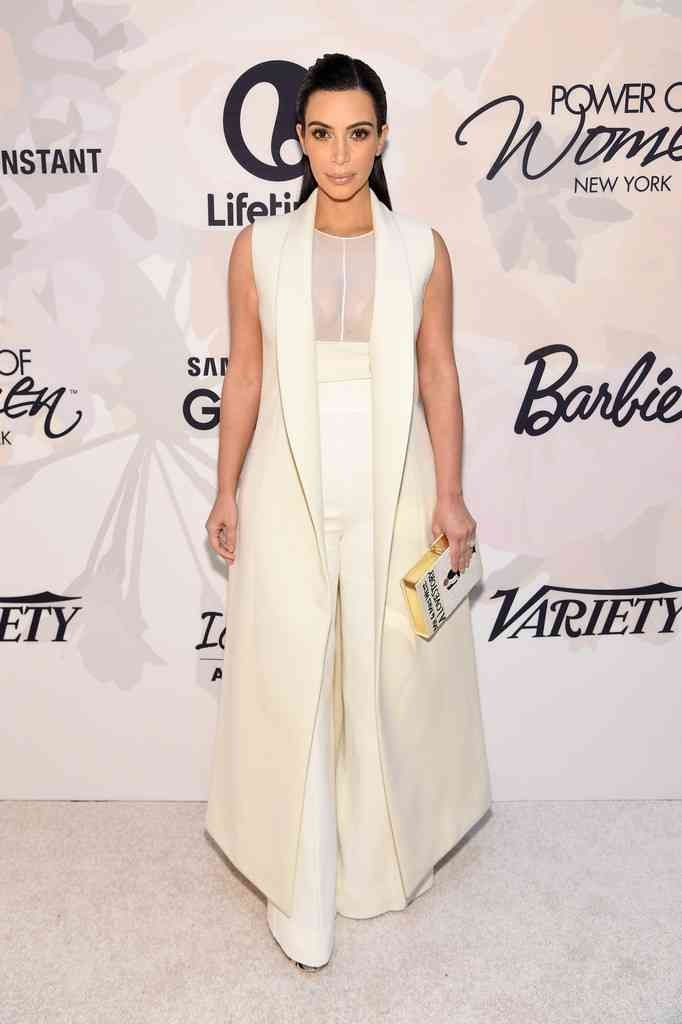 | Nhờ quần cạp cao, Kim thoải mái mặc đồ màu sáng mà không mang cảm giác mũm mĩm. |