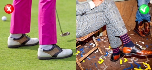 Đàn ông không nên đi tất trắng, trên thực tế nó không phù hợp với hầu hết các trang phục dành cho phái mạnh. Nó sẽ thu hút sự chú ý không cần thiết nếu bạn không kết hợp đúng cách với đôi giày và trang phục. Tất đen chỉ nên đi cùng với quần và giày đen. Không nên đi tất đen với quần kaki/ hoặc giày sáng màu.