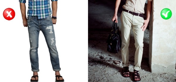 Đây là lỗi thời trang mà khá nhiều anh chàng mắc phải. Tuy nhiên, nó tồi tệ hơn khi các đấng mày râu đi dép tông với quần âu tới nơi làm việc. Những đôi dép như thế này hoàn toàn được chấp nhận trên bãi biển hoặc nơi bạn đang đi dạo trong khu vườn nào đó để thư giãn nhưng hoàn toàn không nên sử dụng chúng trong không gian văn phòng làm việc. Dép tông cũng có thể chấp nhận được khi bạn kết hợp chúng với quần short, nhưng nếu bạn đang mặc quần jean/chinos/quần short sang trọng thì hãy nên ghép nối chúng với giày da hoặc sandal.