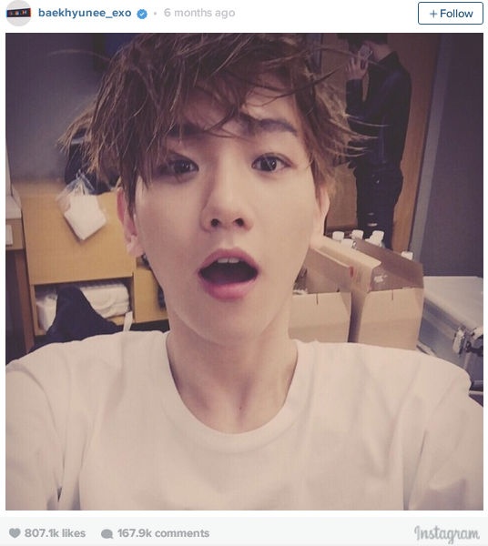Vị trí thứ 4 trong danh sách thuộc về Baek Hyun của EXO. Chàng ca sĩ điển trai có 4,6 triệu người theo dõi. Tấm ảnh Baek Hyun chụp trong một sự kiện quảng bá Call me baby của EXO thu hút hơn 800.000 like và 167.000 comment.