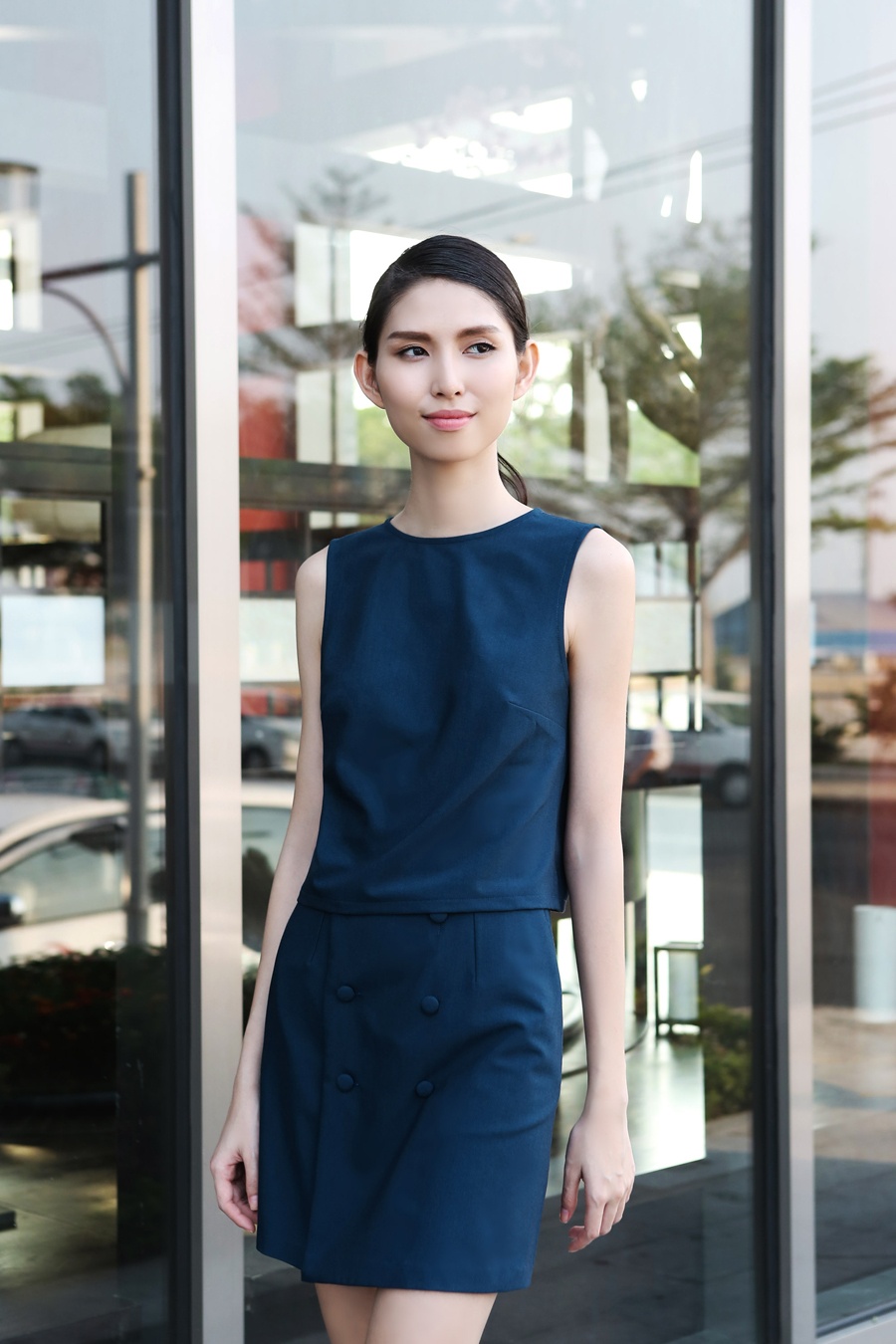 | Bộ trang phục tối màu với những đường cắt cúp hiện đại, khỏe khoắn là lựa chọn hoàn hảo của các bạn gái khi đi làm, lúc dạo phố... Chân váy cài khuy trước hợp xu hướng. |