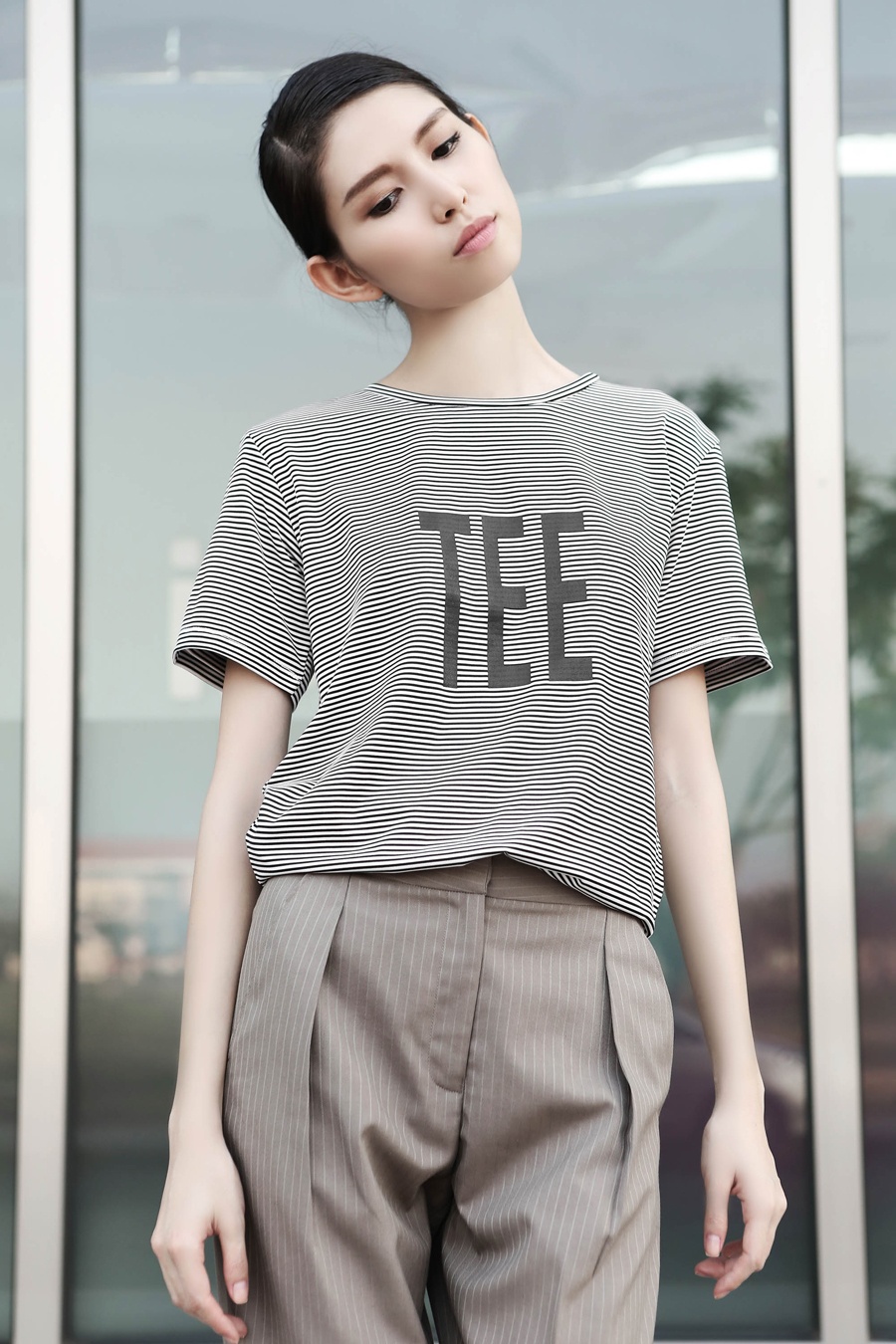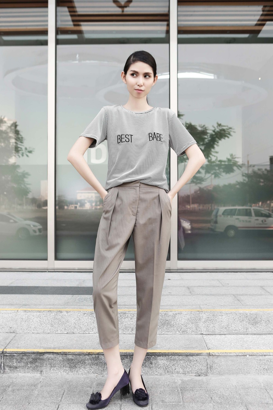 | Ở bộ trang phục này, Thùy Dương chọn tông màu nâu xám làm chủ đạo. Quần và áo thun ton-sur-ton bởi những đường kẻ trẻ trung. Áo thun in chữ đơn giản mang lại nét khỏe khoắn, năng động cho người mặc. |