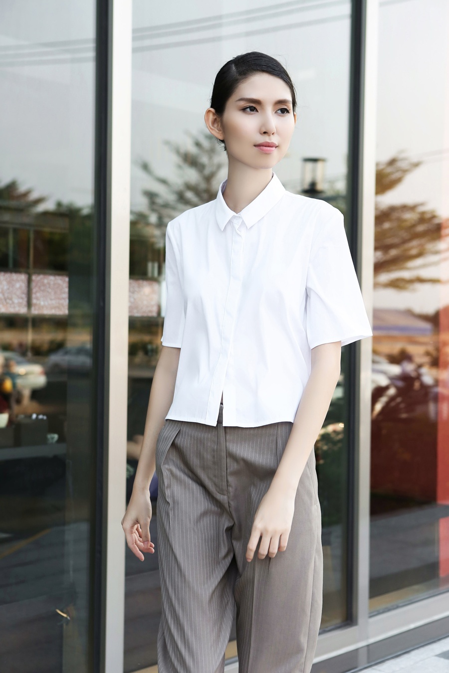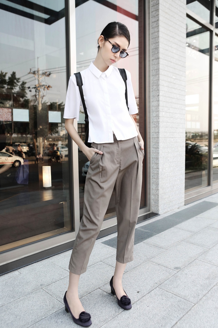 | Cùng với chiếc quần nâu sọc kẻ chìm, nữ người mẫu thay đổi phong cách với áo sơ-mi trắng lửng hiện đại. |