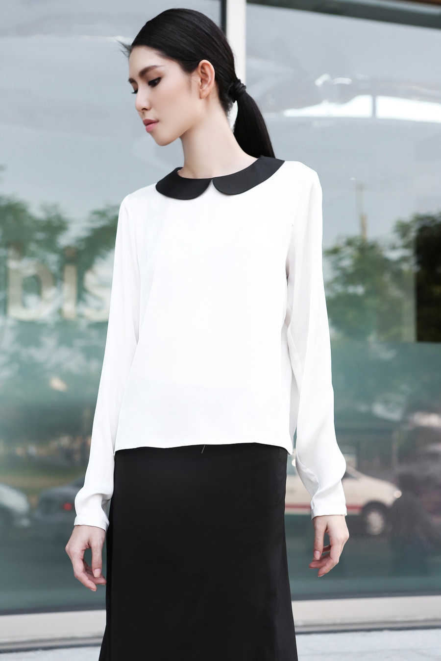 | Trang phục trắng đen được tạo điểm nhấn cổ áo peter pan rất duyên dáng. Cách kết hợp chân váy với áo voan dài tay là sự lựa chọn hàng đầu của những chị em thích phong cách kín đáo. |