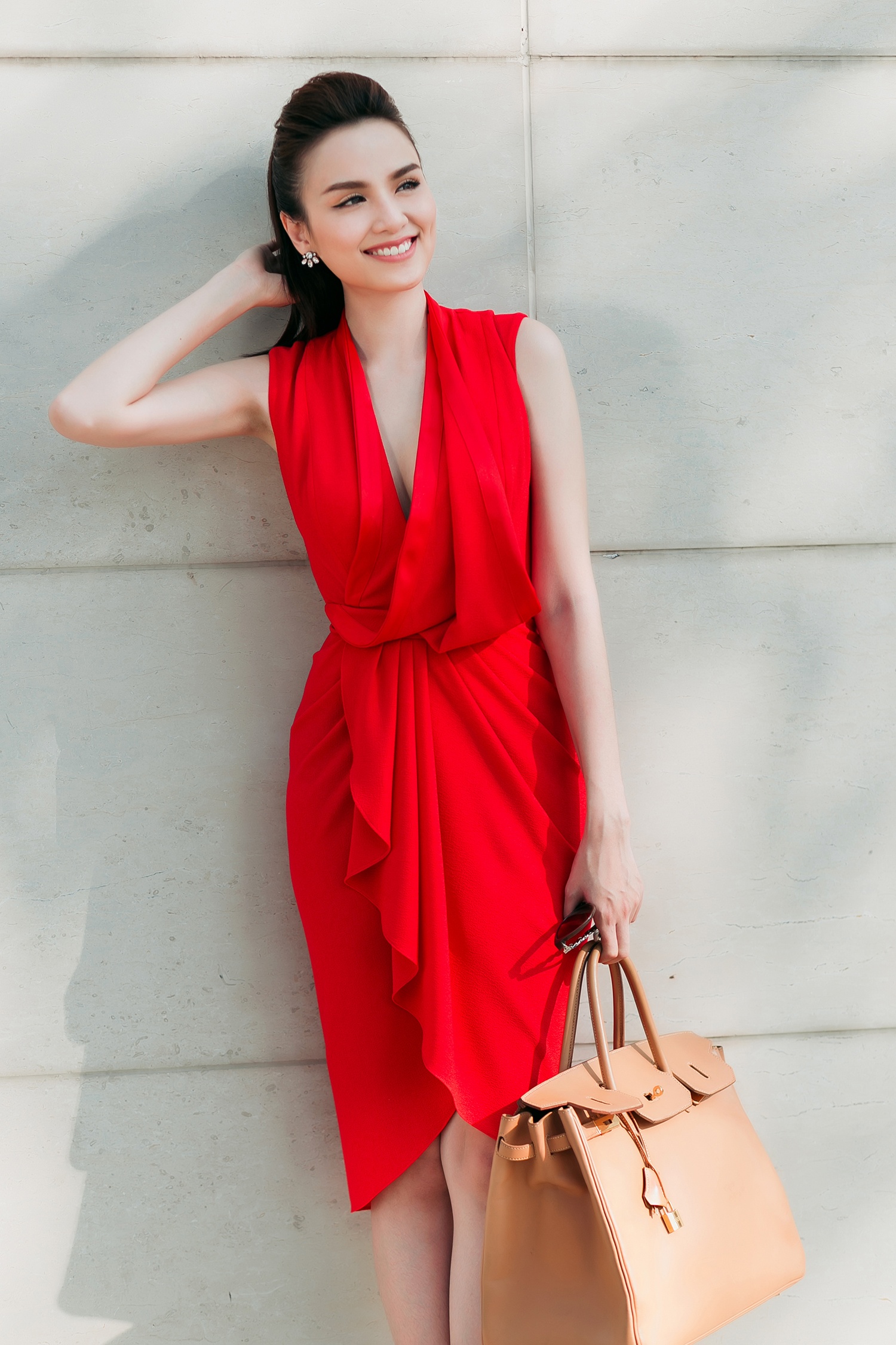 | Trong bộ ảnh mới, người đẹp sinh năm 1990 rạng rỡ trong những bộ cánh phong cách thanh lịch, sang trọng. Tông đỏ tôn nước da trắng sáng của hoa hậu. |