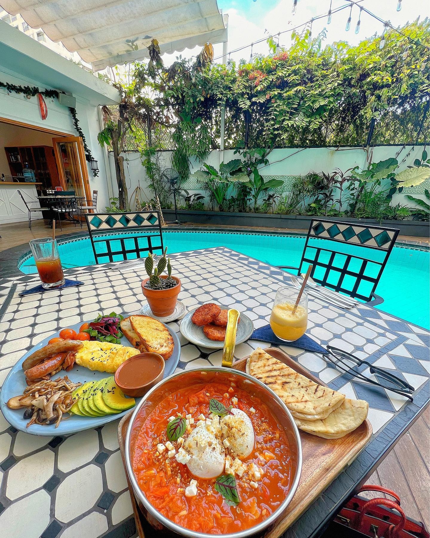 - Thực đơn brunch tương đối phong phú. Các món signature phải kể đến gồm trứng chần sốt cà chua cay kiểu Morocco, phô mai feta, bánh mì dẹt nhà làm; pancake việt quất và bơ tổ ong; cá hồi đại dương xông khói kết hợp trứng chần, trứng cá hồi, sốt hollandaise và bánh khoai tây.