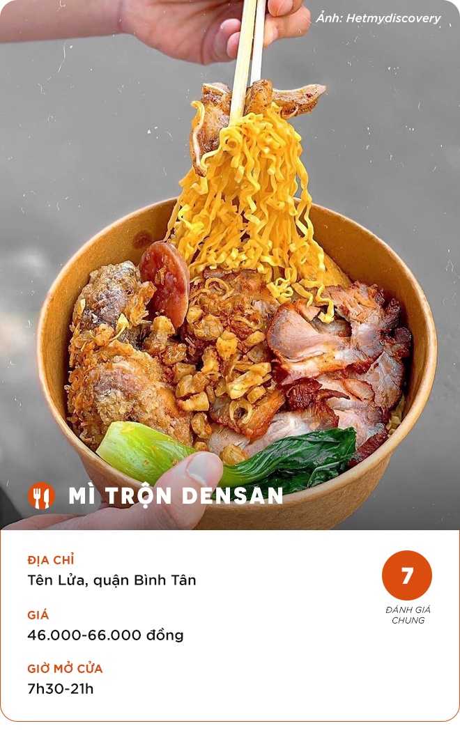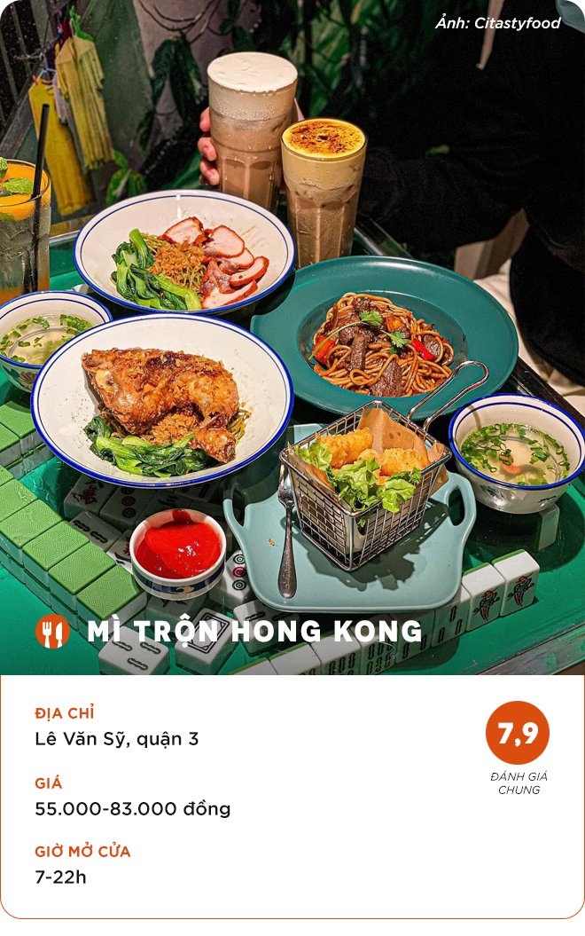 Đây là địa chỉ thưởng thức mì trộn quen thuộc của nhiều người sành ăn ở TP.HCM. Một suất mì trộn đầy đủ gồm gà mắm tỏi, xá xíu, bò viên, lạp xưởng, phá lấu, tóp mỡ... Mỗi phần ăn có thêm súp trứng lòng đào để không bị khô.