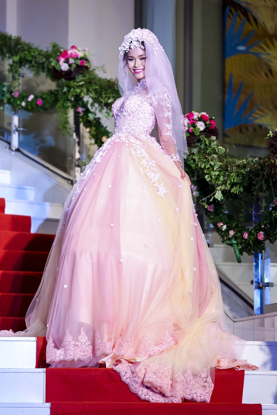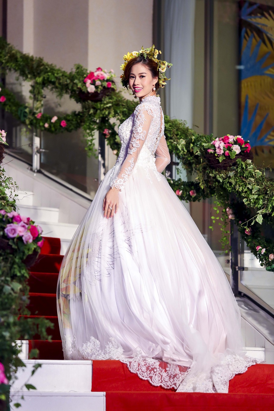 | Tối 4/7, Mâu Thanh Thủy tham gia trình diễn với vai trò vedette trong một sự kiện thời trang. Nữ người mẫu diện bộ váy cưới gam trắng kiêu sa, kèm lúp voan sang trọng. |