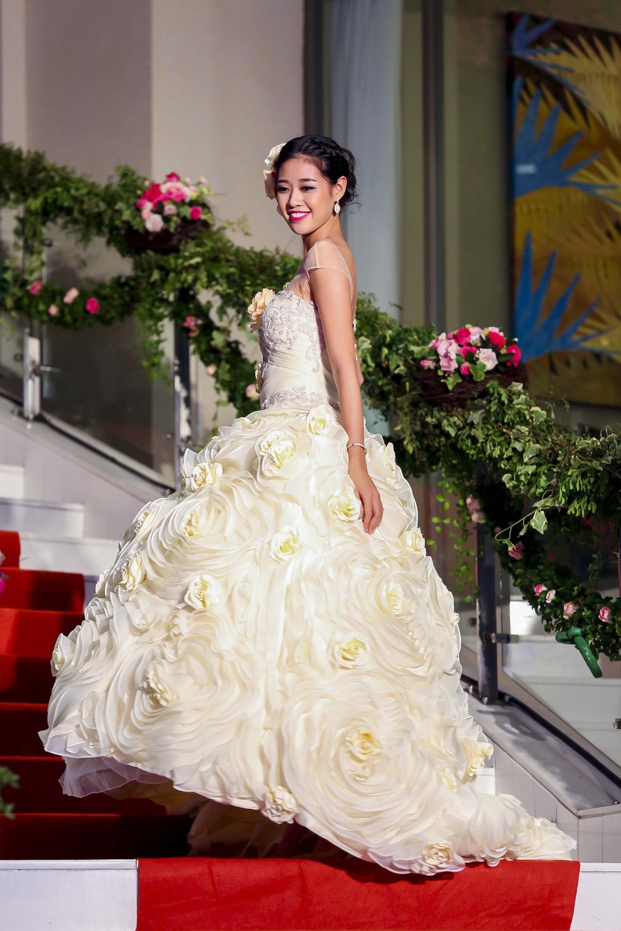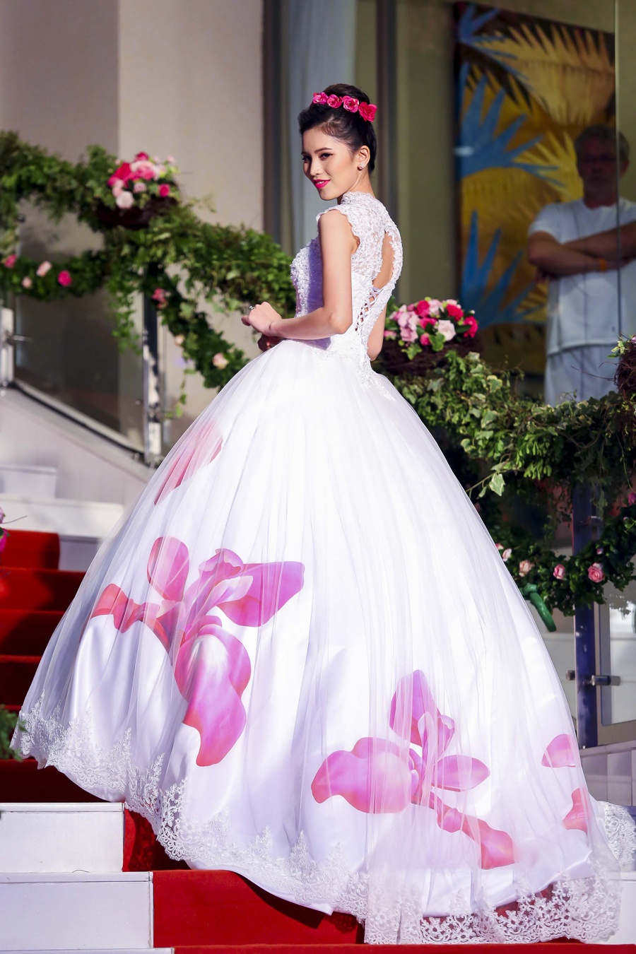 | Cùng với Mâu Thanh Thủy, người mẫu Tô Uyên Khánh Ngọc đảm nhận vai trò chốt màn. Chân dài di chuyển nhẹ nhàng trong bộ cánh kết cánh hoa hồng ấn tượng. |