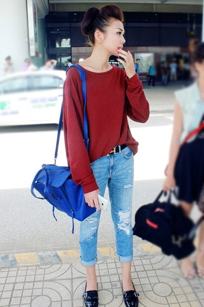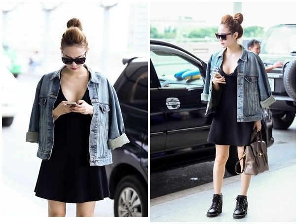 | Hồ Ngọc Hà: Không kém cạnh người bạn thân Thanh Hằng, Hà Hồ cũng là một trong những biểu tượng thời trang sân bay nổi bật của làng giải trí Việt. So với siêu mẫu, hình ảnh của nữ ca sĩ Lặng thầm một tình yêu có phần đơn giản và thoải mái hơn rất nhiều. Bà mẹ một con chuộng mốt áo thun thoải mái, mix cùng jeans hoặc chân váy. Nữ ca sĩ cũng "tôn sùng" những đôi giày đế bệt, mang lại cảm giác tiện lợi khi di chuyển nhiều. |