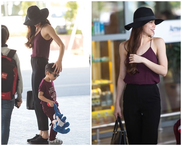 | Bà mẹ một con cũng rất yêu thích những gam màu tối trầm. Áo hai dây từng được cô ứng dụng khi xuất hiện ở sân bay cùng con trai Subeo. Hà Hồ là người dẫn đầu trào lưu khi kiểu mốt này nở rộ trong showbiz Việt. |