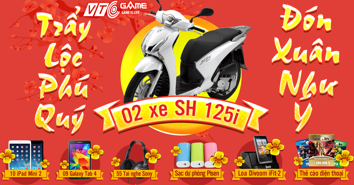 Năm nay, VTC tri ân và tặng quà cho những người chơi mới của thể loại chơi game trúng thưởng. Với việc phát hành minigame Trẩy lộc chỉ trong dịp Tết năm nay, nhà phát hành này đã tặng không cho người chơi game cơ hội trúng những giải thưởng lớn: xe máy SH 125i, iPad Mini, Galaxy Tab… Tham gia "trẩy lộc" tại đây http://tet.vtcgame.vn.