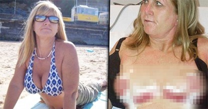 3. Huấn luyện viên thể hình Kim Brockhurst (51 tuổi) cũng gặp phải tai nạn kinh hoàng sau khi tân trang vòng một. Ngực của bà Kim vỡ do bác sĩ bơm silicon quá nhiều so với khả năng chịu đựng của cơ thể. Điều này khiến khối silicon bị rò rỉ dịch và phát nổ. Một lý do nữa là bởi bà được trung tâm thẩm mỹ sử dụng chất liệu “rởm” để bơm ngực.
