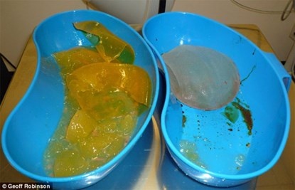 Sau 8 năm, ngực bên phải của nữ người mẫu bắt đầu tăng kích thước dần và vô cùng đau đớn. Một bên núi đôi sưng to bằng đầu người. Nó khiến cô đau nhức tới mức không thể nhấc nổi tay. Cho tới khi siêu âm, người ta phát hiện ra cục silicon nâng ngực đã bị vỡ.