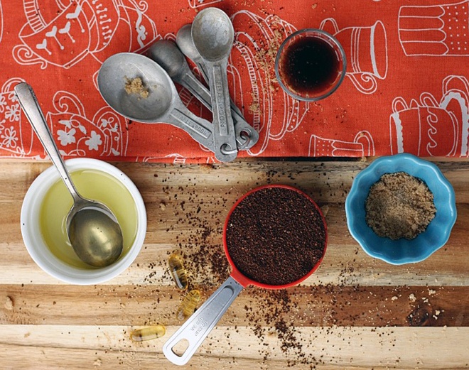 Bạn cần chuẩn bị 3 thìa bã cà phê vừa lọc qua phin, 1 muỗng canh dầu ô liu (hoặc dầu dừa, dầu hạnh nhân), 1 muỗng canh đường nâu. Trộn đều hỗn hợp khô gồm cà phê và đường nâu, sau đó cho thêm dầu và bôi hỗn hợp lên da mặt. Massage nhẹ nhàng theo chuyển động tròn sau đó rửa sạch với nước ấm.