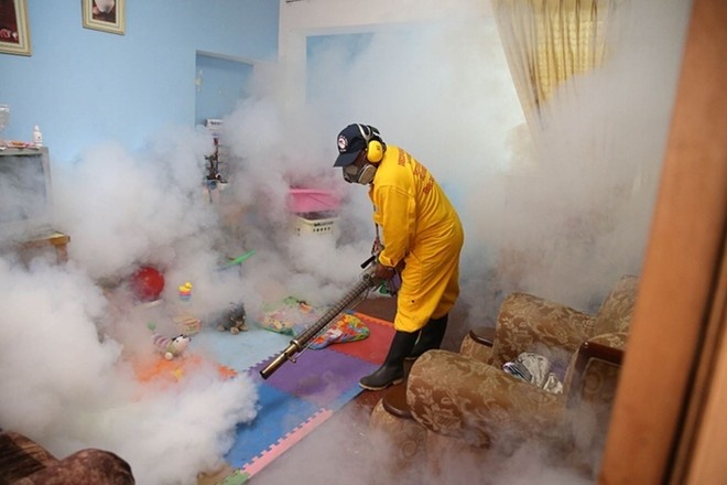Lực lượng chức năng phun thuốc diệt muỗi tại một hộ gia đình ở quận Carabayllo, thủ đô Lima của Peru. Ảnh: Tân Hoa Xã. |