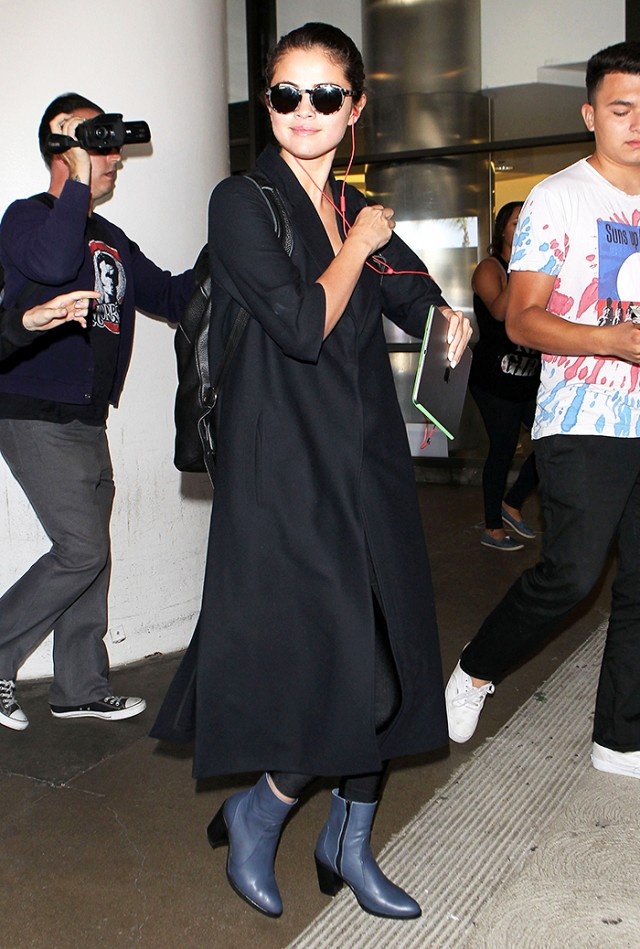 Selena Gomez chọn đôi bốt màu xanh xám làm điểm nhấn thu hút cho trang phục tông đen. |