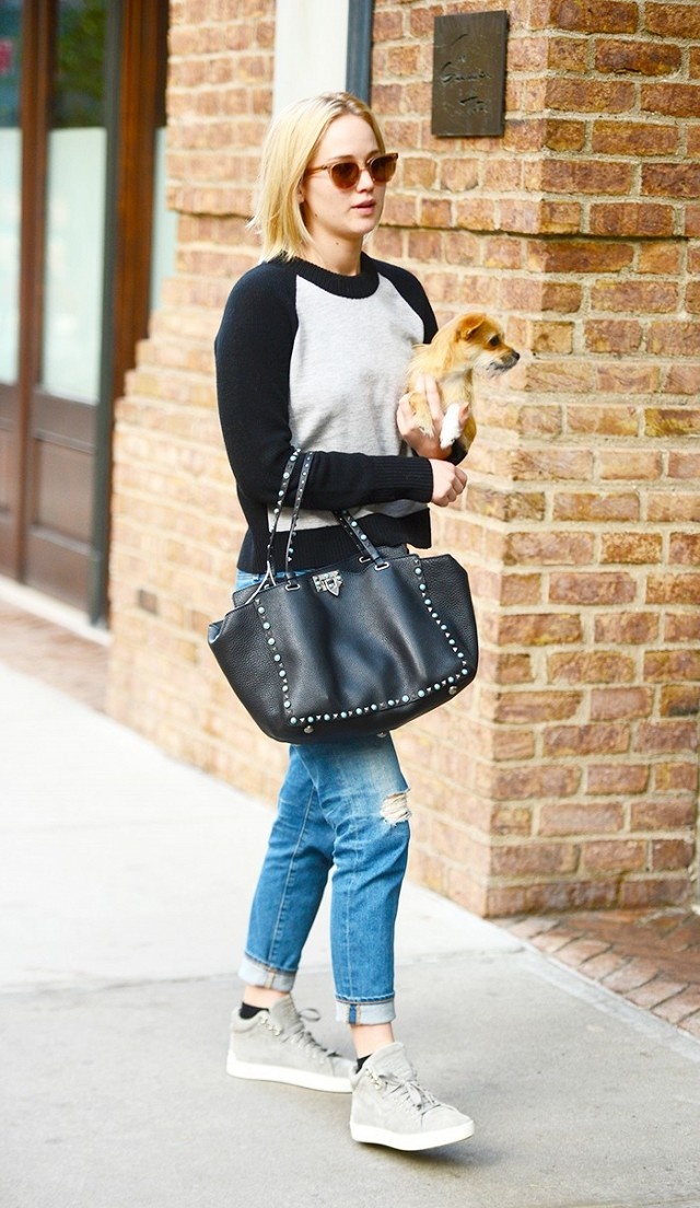Jennifer Lawrence đơn giản với áo sweater đen-trắng, jeans boyfriend và sneakers cao cổ khi đi dạo phố với thú cưng. |