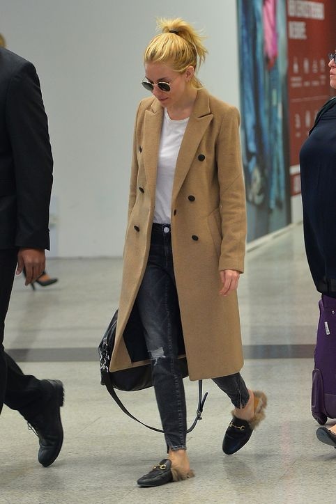 Sienna Miller cũng đi đôi giày ấm cúng này đến sân bay. Cô diện set đồ đơn giản với áo phông trắng, quần jeans đen và áo khoác dáng dài. |
