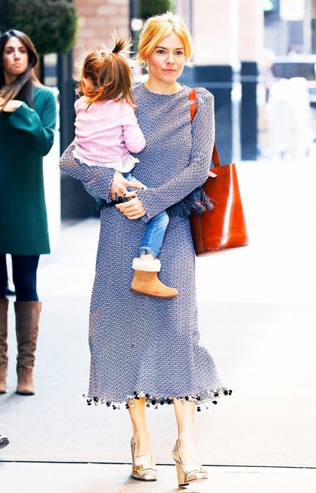 4. Giày ánh kim: Dù chỉ mặc một chiếc váy kiểu dáng hết sức bình thường nhưng nhờ kết hợp với một đôi cao gót đế thô ánh kim nên set đồ của Sienna Miller vẫn thời thượng và cá tính. |