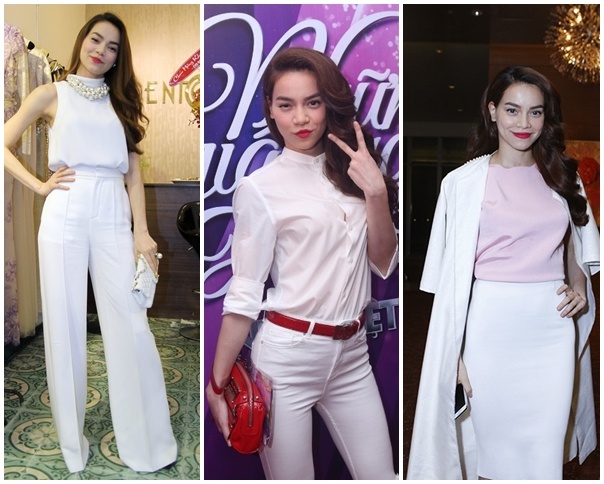 | Các tông màu được thay đổi giúp hình ảnh bà mẹ 30 tuổi phong phú, linh động từ gợi cảm cho đến cá tính. Đối lập với vẻ "dữ dội" khi bước lên sân khấu, Hồ Ngọc Hà tin dùng gam màu trắng khi tham dự các sự kiện giải trí, họp báo hoặc gặp gỡ người hâm mộ. |