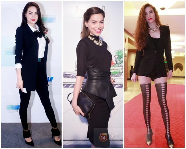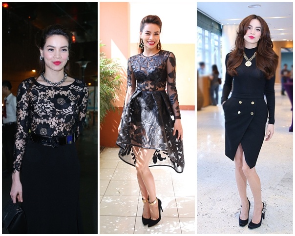 | Đi cùng trang phục sang trọng, tông màu đen góp phần tạo hình ảnh chuyên nghiệp, sành điệu và tôn nước da trắng hồng của người mặc. Trong ảnh là những bộ cánh tông màu tối trầm từng giúp Hồ Ngọc Hà lọt top bình chọn sao đẹp trong tuần. |