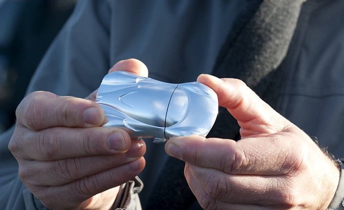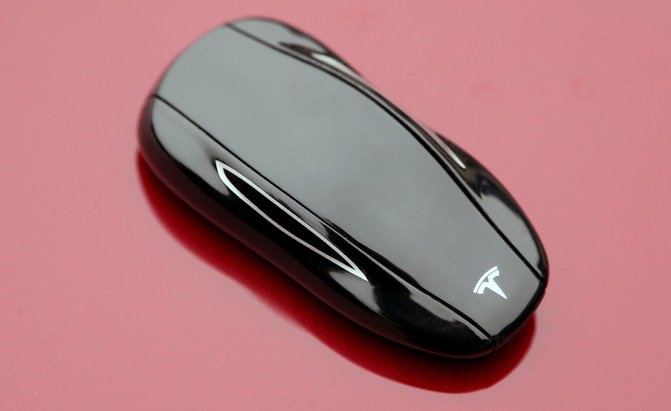 | Chìa khóa của chiếc Tesla Model S cũng mô phỏng hình dáng của xe, tuy nhiên, thiết kế của nó bóng bảy và không thể nhìn thấy các nút chức năng. |