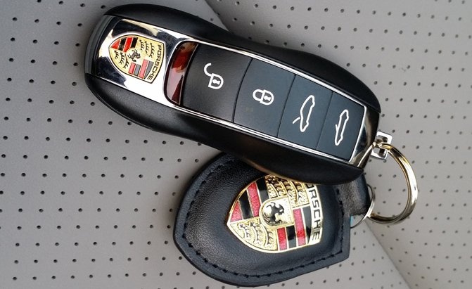 | Chìa khóa của Porsche cũng có thiết kế giống như một chiếc xe thu nhỏ. Bên cạnh logo, một số chức năng được tích hợp như mở mui nếu là một chiếc mui trần hoặc kích hoạt chức năng nhớ vị trí ghế. |