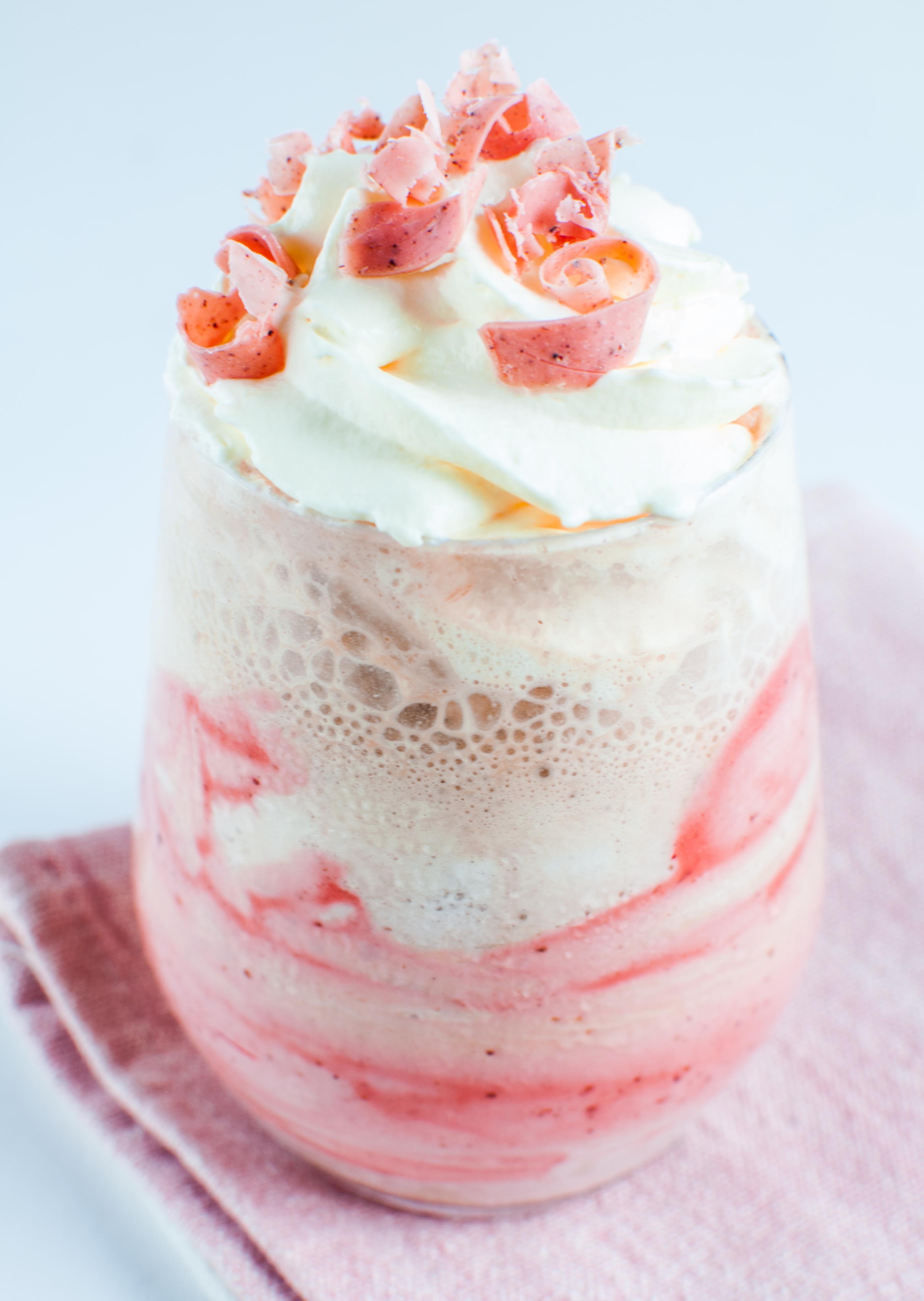 Valentine Pink Mocha là sự kết hợp hoàn toàn mới giữa sốt pink chocolate được làm từ socola với raspberry được nghiền thành bột cùng với sữa tươi, cà phê espresso cùng một chút béo của whipping cream. Món nước này thơm vị socola dâu và mát lạnh.