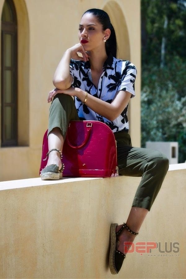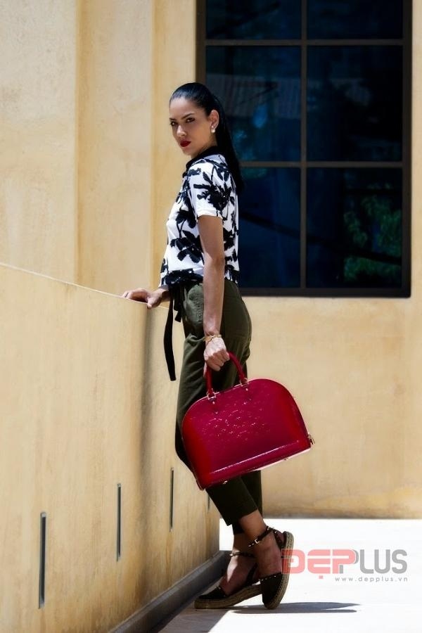 Bộ trang phục thứ 2 mang phong cách đơn giản nhưng không kém phần cá tính và thanh lịch với áo sơ mi họa tiết kết hợp cùng quần baggy dáng lửng gam màu quân đội. Chiếc túi xách Louis Vuitton gam đỏ nổi bật sẽ là điểm nhấn sáng giá giúp set đồ gam trung tính thêm ấn tượng.