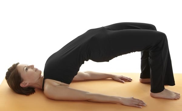 | 1. Động tác cây cầu (The Half Bridge): Nằm ngửa, đầu gối cong lên. Thở ra, dùng lực của chân đẩy cơ thể lên cao cho đến khi cơ thể và vai tạo thành một đường thẳng. Khi nâng cơ thể lên, bạn giữ nguyên cổ, đầu và hai cánh tay trên sàn. Giữ động tác trong 30 giây rồi quay trở lại vị trí bình thường và lặp lại 3 lần. |