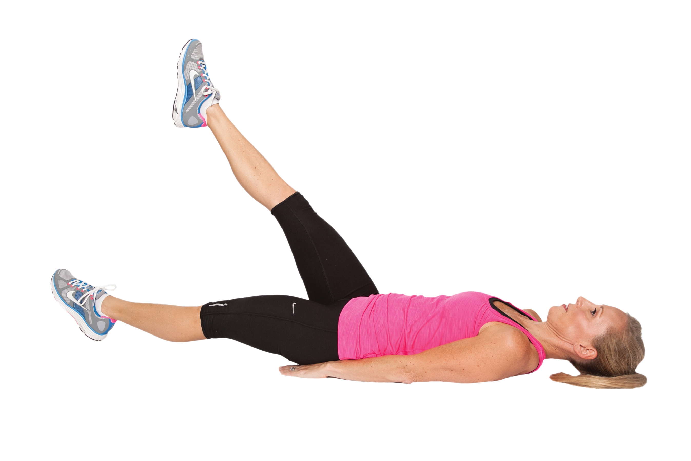 | 2. Nâng chân (Leg Lifts): Nằm ngửa với 2 cánh tay đặt song song 2 bên. Giữ chân thẳng và nâng chân phải của bạn cho tới khi tạo thành một góc 90 độ so với hông. Hạ thấp chân sau 30 giây, sau đó lặp lại các bước trên với chân trái. Trong khi nâng, bạn phải thở ra và hít vào khi hạ thấp. |