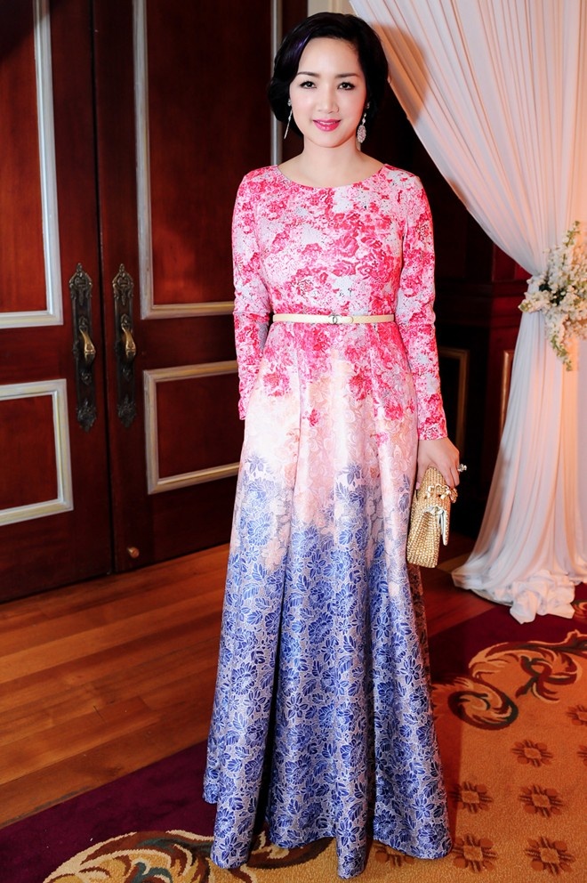 | Hoa hậu đền Hùng Giáng My trở thành điểm nhấn tại một sự kiện nhờ hình ảnh lộng lẫy. Lần này, cô diện bộ đầm cổ điển, có họa tiết hoa hoàng gia quý phái. Tông màu xanh chuyển hồng hợp xu hướng. Phom dáng váy kín đáo hợp vóc dáng, độ tuổi người đẹp U50. Cách chọn trang phục hòa nhập không gian sự kiện mang về những đánh giá cao cho hoa hậu. |
