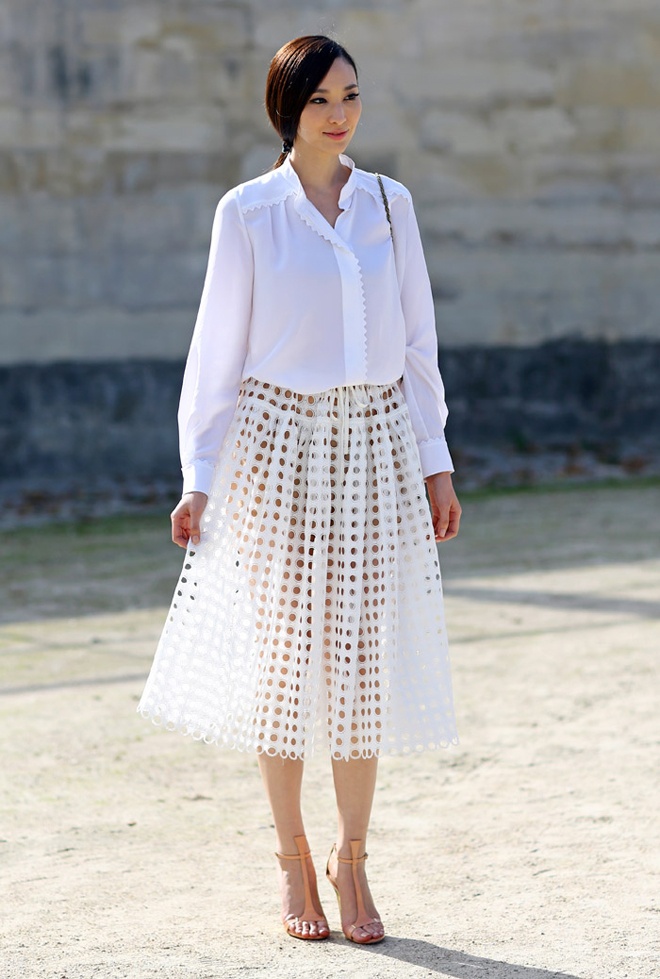 | 1. Mix cùng váy midi trắng. White on white đang rất được yêu chuộng trong năm nay, vì vậy đừng ngại diện nguyên cây trắng khi đến công sở. Kết hợp áo sơ mi trắng cổ điển với váy midi trắng điệu đà chất liệu ren hay xuyên thấu là cách nhanh nhất để bạn thật mới lạ, sang trọng trong mắt sếp và đồng nghiệp. |