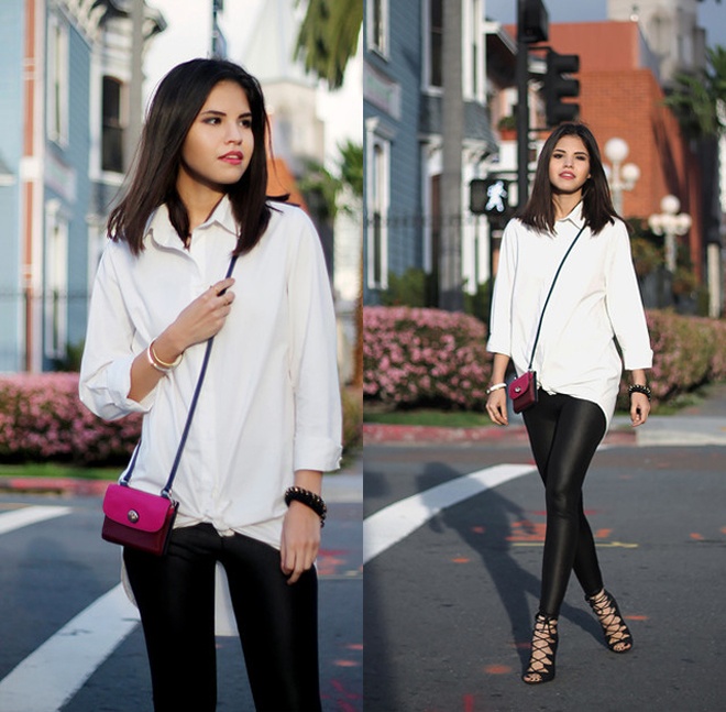 | Để diện áo sơ mi trắng theo cách này, bạn cần chăm chút thêm cho phụ kiện. Một đôi giày cao gót màu sắc nổi bật, vòng tay và dây chuyền bản lớn sẽ tăng thêm hiệu ứng ấn tượng cho tổng thể trang phục. |