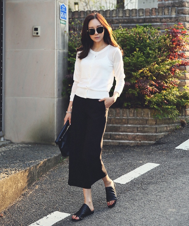 | Dép lê tông đen mix hoàn hảo cùng trang phục đen trắng. |