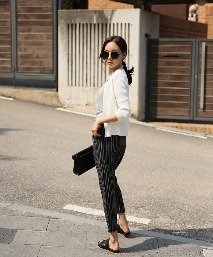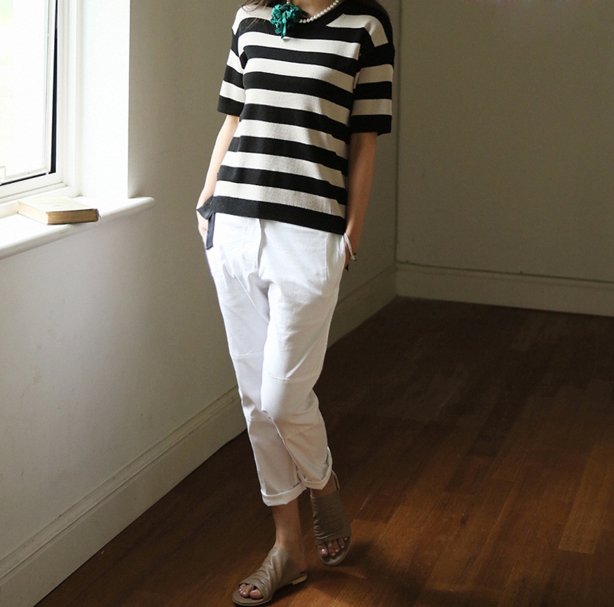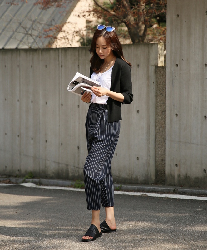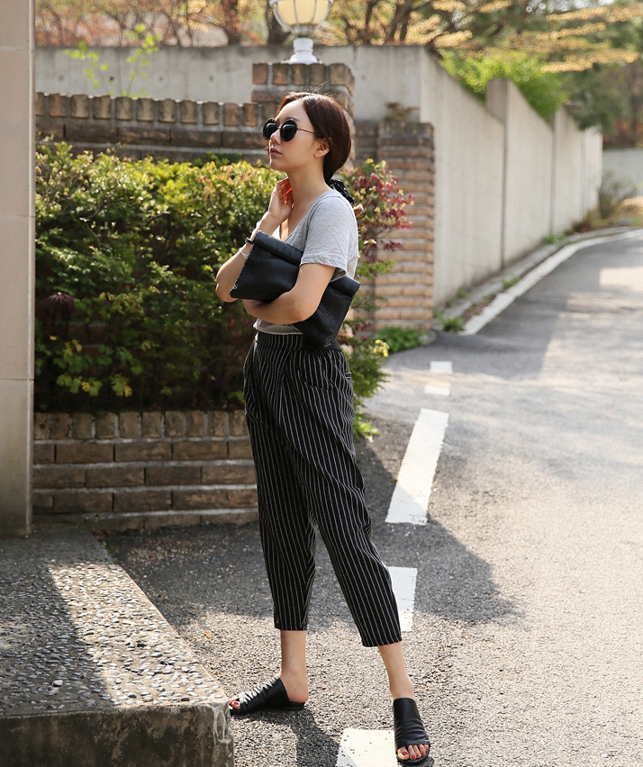 | Gợi ý cách mix trẻ trung với quần trắng, áo thun kẻ với mẫu dép lê quen thuộc. |