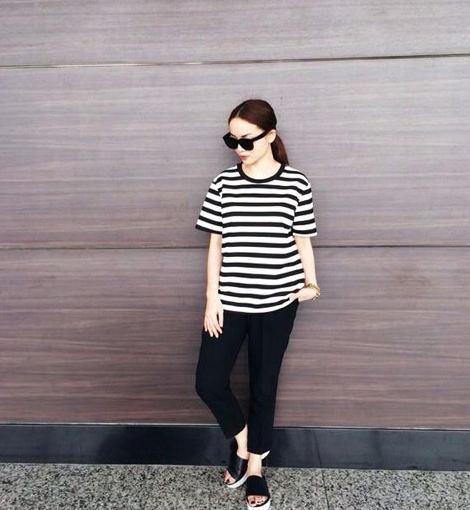 | Yến Trang lựa chọn quần âu, áo kẻ để mix kèm dép lê có tông đen nổi bật. |