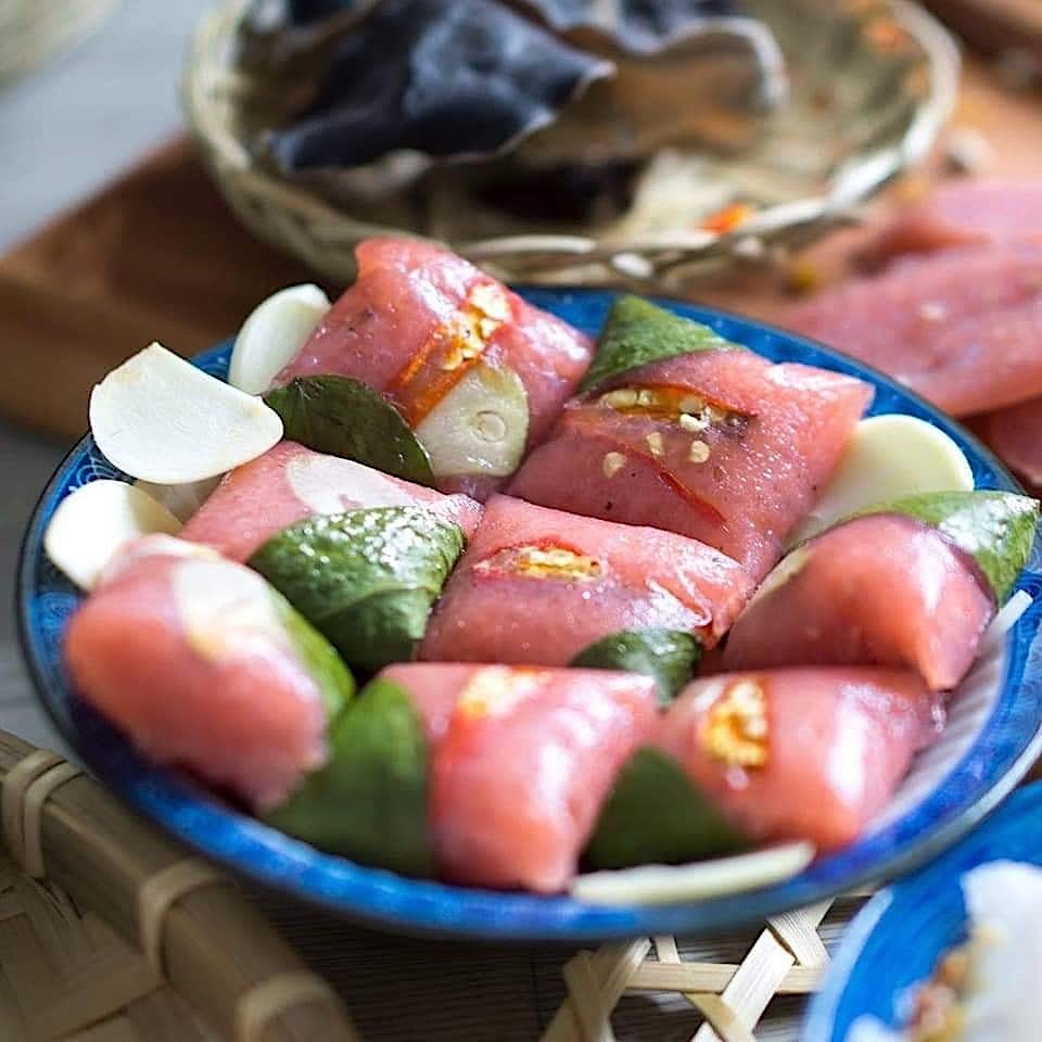 Nem Lai Vung là đặc sản trứ danh của Đồng Tháp, có màu sắc đỏ hồng, được nhiều người ưa chuộng dịp Tết. Nguyên liệu chủ yếu để chế biến nem chỉ đơn giản là thịt nạc, bì heo. Hương vị đặc trưng của nem Lai Vung từ lâu đi vào câu ca: "Lai Vung là xứ lạ lùng/ Nem chua mà ngọt, thơm nồng mà say". Ảnh: Angibando. |