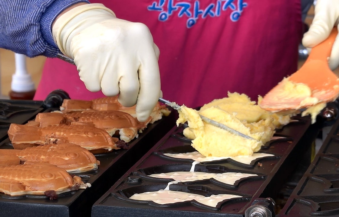 Vào mùa đông ở Hàn Quốc, bánh cá bungeoppang thơm lừng khiến nhiều du khách khó lòng chối từ. Để làm bánh, người ta đổ đầy bột vào những khuôn gang hình cá chép, thêm ở giữa hỗn hợp đậu đỏ như lối truyền thống hoặc thành phần khác tùy thích, rồi nướng lên. Ảnh: Foody Trip. |