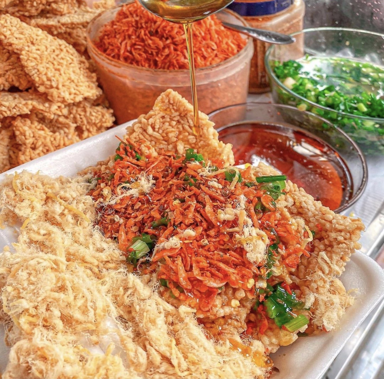 Cơm cháy thường được chế biến từ hạt gạo nếp hương. Hạt gạo tròn, có độ dẻo nhiều, được nấu bằng nồi gang và đem phơi nắng tự nhiên. Sau cùng, phần cơm cháy được cho vào chảo rán vàng để có độ giòn xốp. Cơm cháy có thể được dùng cùng nước mắm mỡ hành, tôm băm, thịt chà bông... Khi ăn, bạn sẽ cảm nhận được vị giòn và hương thơm của gạo, vị mặn của ruốc hay vị ngậy của nước sốt kèm theo. Nhiều hàng quán vỉa hè ở Sài thành phục vụ món ăn dân dã này. Ảnh: Bineating_. |