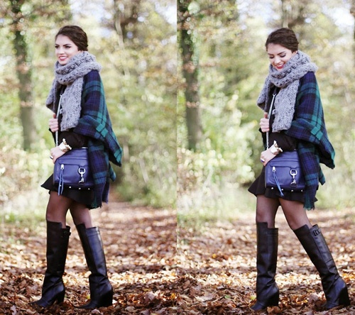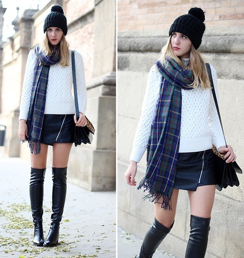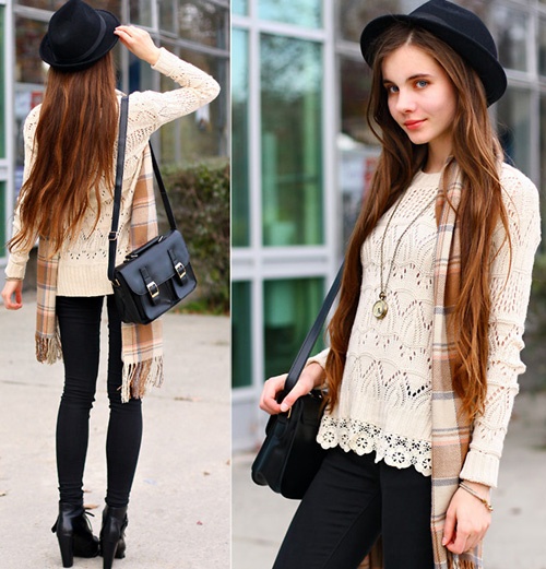 Một chút vintage điệu đà với khăn dạ kẻ và áo len dáng dài.