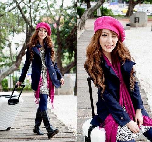 Khăn dáng dài mix khéo léo cùng mũ với tông màu hồng nổi bật.
