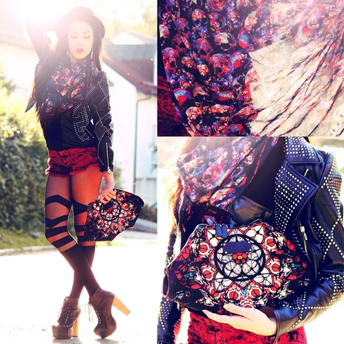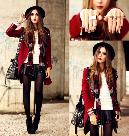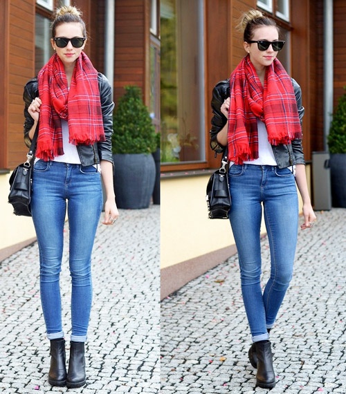 Tông kẻ đỏ rực cực nổi bật khi mix kèm áo da tối màu và quần jeans.