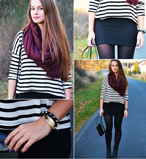 Vẻ thanh lịch duyên dáng của pashmina khi mix kèm chân váy ôm và áo len kẻ.