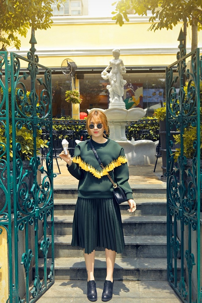 5. Váy xếp pli: Yến Nhi với phong cách rất trẻ trung của váy xếp pli kết hợp áo nỉ khỏe khoắn.