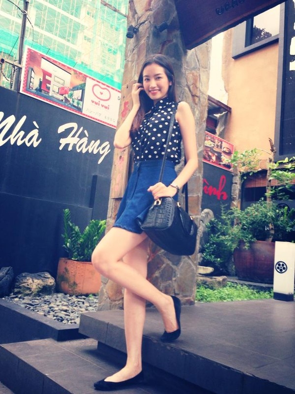 7. Váy denim: Trúc Diễm nhẹ nhàng xuống phố với áo sơ mi họa tiết chấm bi và váy denim dáng xòe.