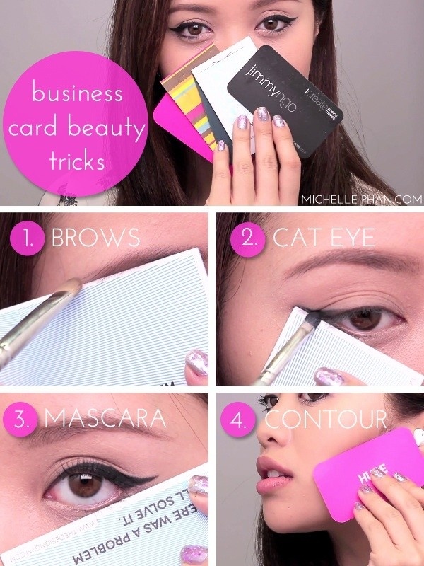Các loại thẻ ngân hàng, thẻ business… đều có thể được dùng trong mẹo vặt này. Bạn dùng cạnh cứng của thẻ giữ sát vào phần cuối đuôi mắt hất lên trên. Dùng eyeliner kẻ dọc theo mép thẻ để tạo được phần cánh hất lên đẹp đẽ. Sau đó tiếp tục dùng eyeliner tô nối đường kẻ đã có với mí mắt trên.