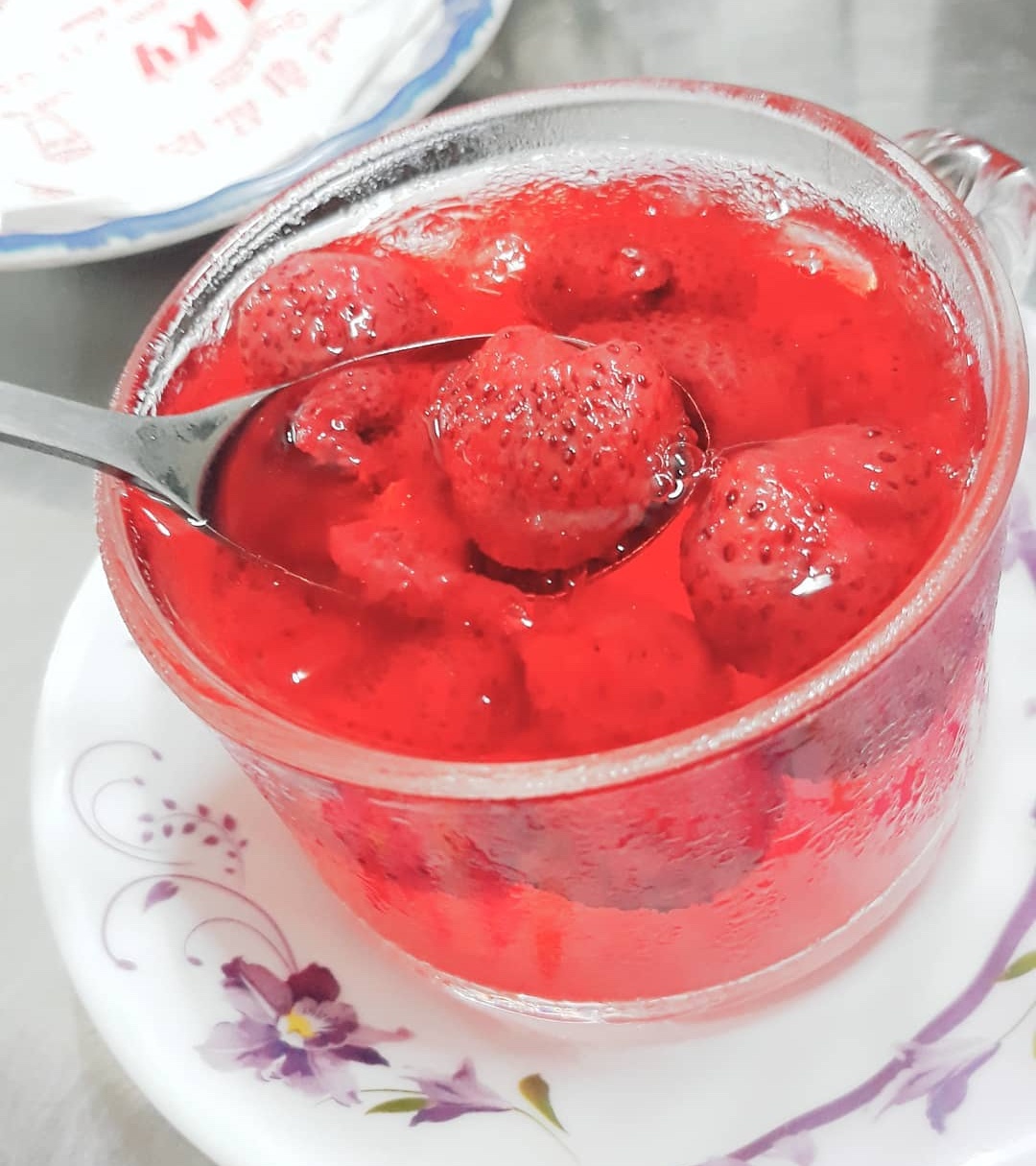 Nếu muốn thưởng thức chè lạnh ở Chợ Lớn, bạn có thể thử qua chè trái dâu với màu sắc đẹp mắt. Người ta sử dụng dâu tây tươi, đường phèn... để chế biến nên món chè vị ngọt thanh, xen lẫn chút chua chua này. Ảnh: Socolatear. |