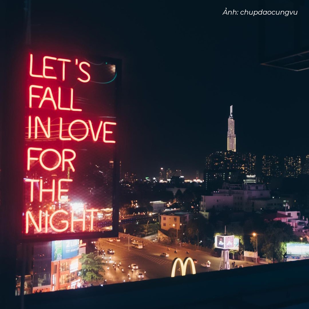 Khu vực ngồi bên ngoài nằm ở tầng thượng của một tòa nhà 9 tầng. Từ đây, bạn có thể quan sát được Landmark 81 và vòng xoay Điện Biên Phủ nhộn nhịp. Được trang trí nhiều đèn neon, khu vực ngoài trời cũng là góc chụp hình của nhiều thực khách. Thang máy của quán chỉ lên đến tầng 8, bạn phải đi bộ thêm một tầng.